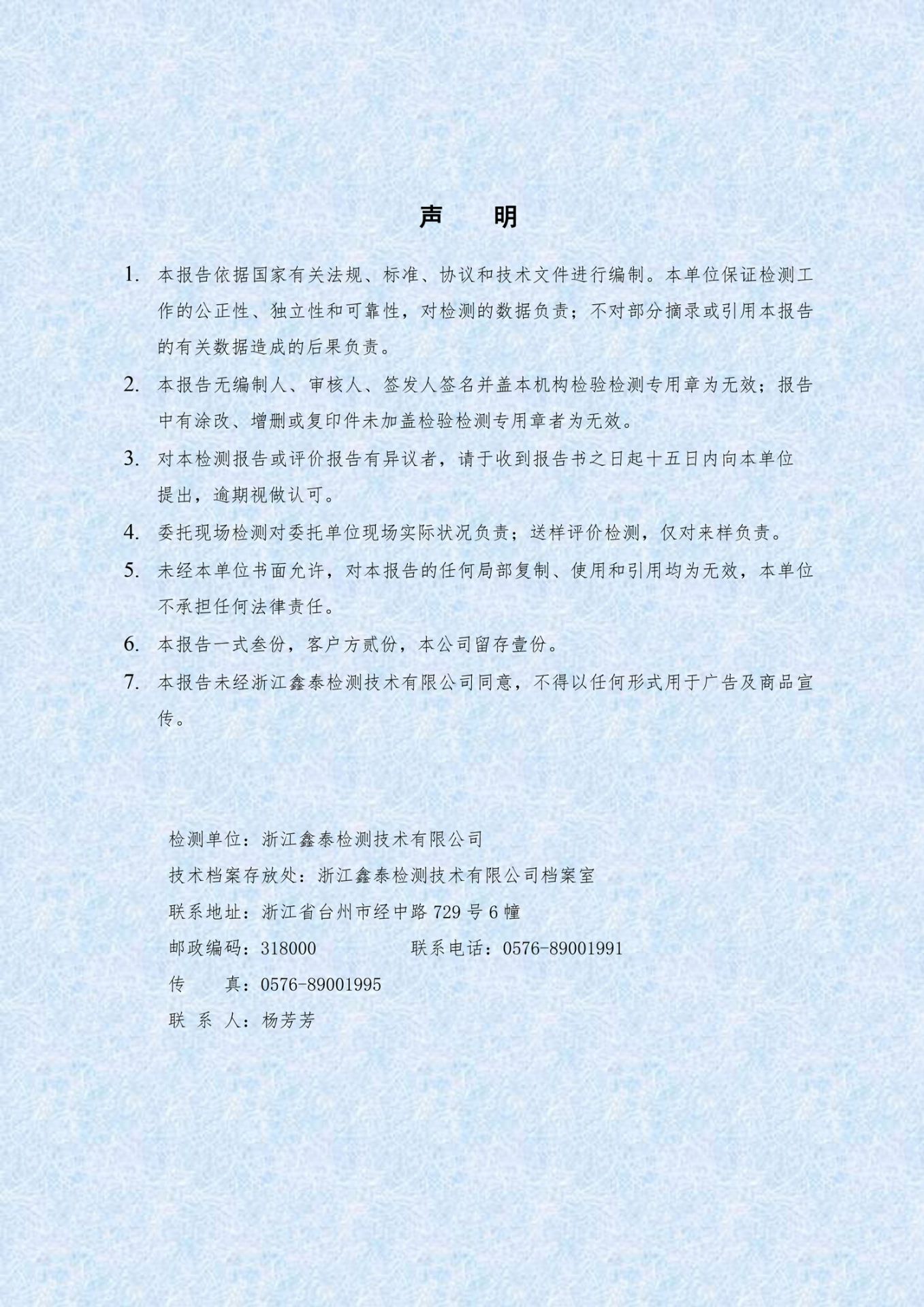 【概要描述】本报告依据国家有关法规、标准、协议和技术文件进行编制。本单位保证检测工作的公正性、独立性和可靠性,对检测的数据负责;不对部分摘录或引用本报告的有关数据造成的后果负责。